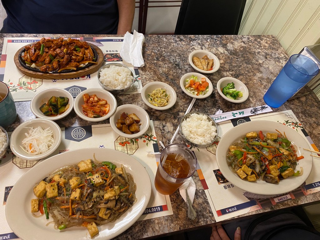 For dinner Derek took us to a Korean restaurant where we stuffed ourselves on rice noodles and tofu and veggies. They automatically load up the table with many little dishes of things: kimchee, potatoes, sprouts, radish, fish, and other veggies. Then the main dish you ordered is added on top of that. It was delicious. We stuffed ourselves and couldn’t finish it all. We got a To-Go box, thinking we would give it to a homeless person outside, but there weren’t any.
