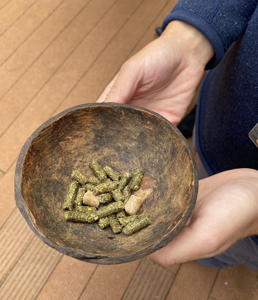 Then we walked out along an elevated walkway to feed the inhabitants. We were each given a half a coconut shell holding what looked like large hamster pellets.