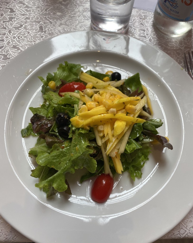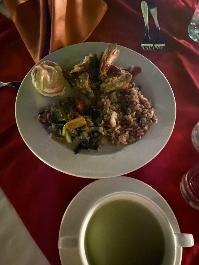 I wondered how long it would take on this trip before I had to start violating my diet (I am allergic to gluten and dairy, and mostly vegetarian). They served a dinner meal on the plane and the options were chicken or pasta. I knew the pasta would be really stupid so I had the chicken. It was very tasty, with rice and green beans, but I didn’t eat the cracker and slice of cheese. The brownie was more fudge than flour so I ate it. And a cup of tea with dairy creamer. Oh well.