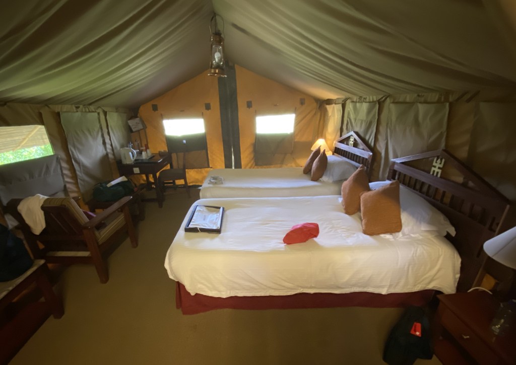 The “tents” here were even fancier than at Sweetwaters. It’s actually a little cottage with a canvas roof which made the falling bits from the tree above sound very loud. We were inside a huge drum, and I do mean HUGE. One corner with a sofa and lamp, two double beds in the center, a rack to hang clothing, a little table with coffee pot in the other corner. The bathroom is behind a half wall behind the beds. Double sinks and walk-in toilet and shower. In the shower, the water comes out of a little thing at the top of the wall like a waterfall.