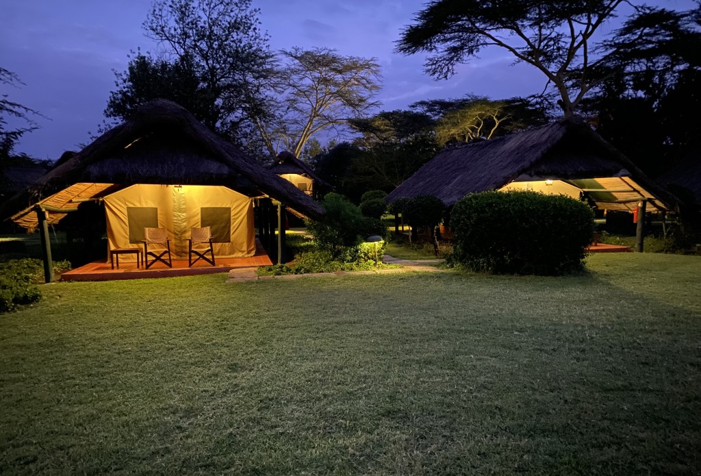 Finally, finally finally we arrived at Mara Engai Lodge, only to find that we had to park below and pile into a different jeep that the lodge provides, to get up (and I do mean UP) the final stretch to the actual lodge, overlooking the valley. Getting into another jeep was the last thing I wanted to do. They greeted us with a glass of juice and a hot face towel. Very nice. During the orientation, they said don’t walk around after dark because of the animals. But during the day is safe.