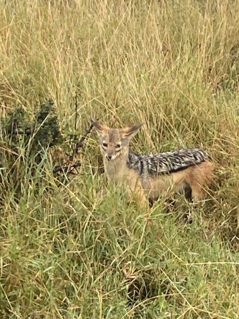 Baboons, Spur fowl, Egyptian geese, Guinea fowl, Buffalo, warthogs, large bird called bustard, geese flying, elephants, zebra, gazelle (black and white stripe on the side), eland the largest antelope, impala with the “M” on their butts, jackal. Leopard! Saw briefly, but he’s a distance away in the grass and then he laid down behind a stump. There are also hogs nearby. Not sure if he’s hunting them. A ranger came along and drove over to it and flushed it out a bit. Turns out it was actually a cheetah.
