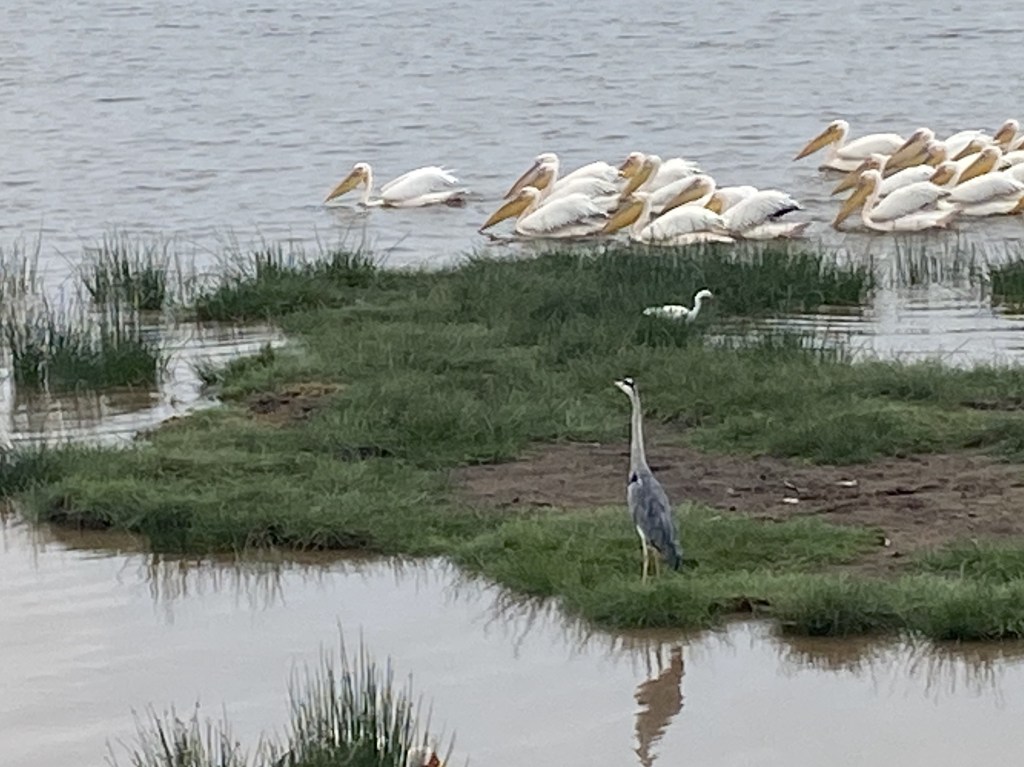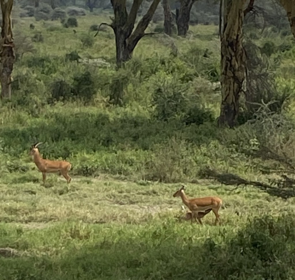 About 1pm we entered Nakuru National Park and took our time crossing the valley, spotting animals, before heading up the other side to the lodge. Pride of eight lions, two young males. Impala family with baby nursing, interrupted by a hyena. They ran away, but I don’t think anyone caught it on video. Gray heron, cormorants, pelicans. Giraffes. Alex counted 23. I could only see 18.