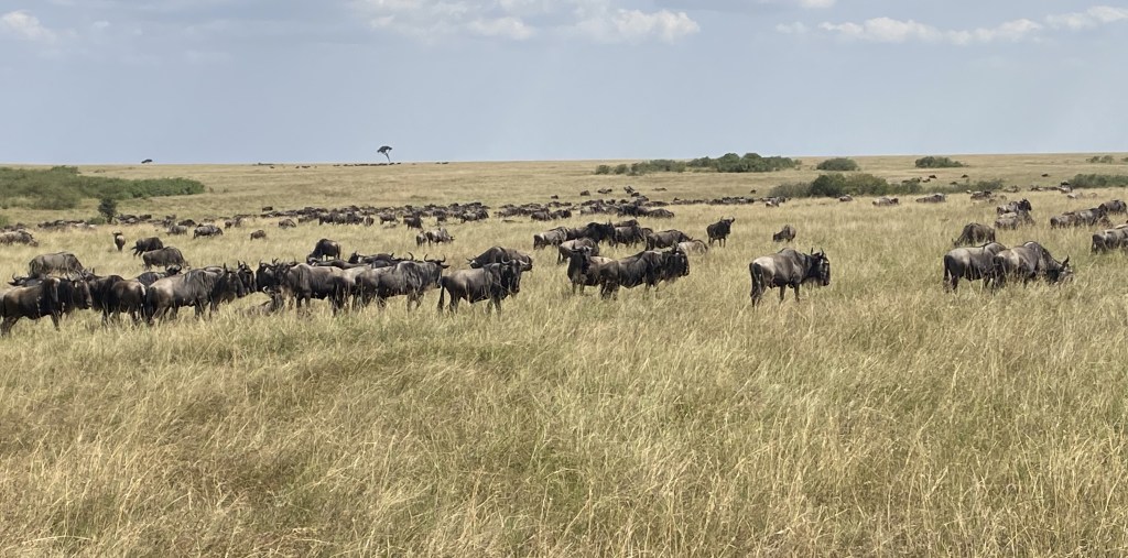 Breakfast 6:30, set out for the drive at 7:30. We’re hoping to see the wildebeests crossing the river. Vultures, zebras, Kettle egret, white bird, gazelles. Huge vast Wildebeest herd. The Great Migration is on!