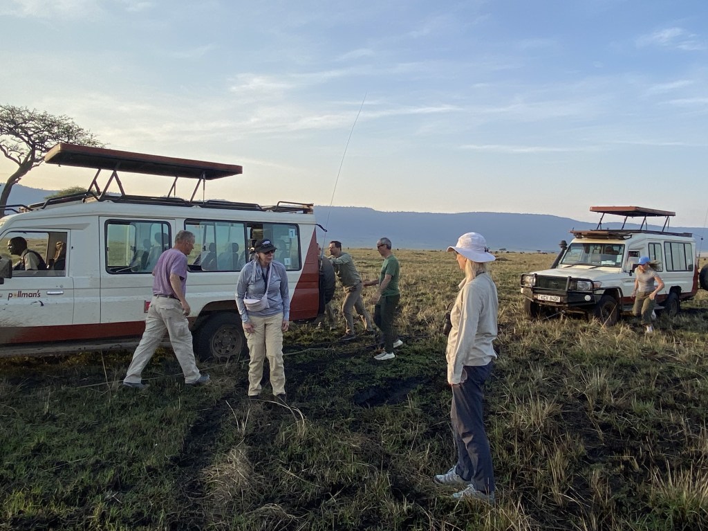 We found the other vehicle. But now it appears we’re stuck as well. As part of the initial trip orientation they tell you NEVER GET OUT OF THE VEHICLE. But now they said, OK everyone out of the vehicle. So I gingerly took my first step directly onto the African prairie. Here I am walking around on wild ground, hoping I wouldn’t step on some little critter.