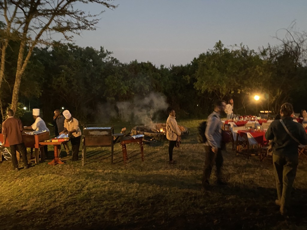 This was our last evening in Kenya. The staff treated us to a “Bush Dinner”. In a small clearing on the lodge grounds, they set up cooking and serving stations, and dining tables. We were treated to a delicious dinner, followed by some cultural entertainment: songs and costumes and a jumping contest for the men. It is said the man who can jump the highest is the most attractive to the women.