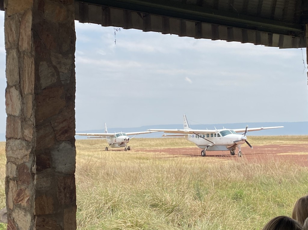 At the airstrip now. Bunch of school kids here to watch the airplanes. It really is just an airstrip. Only an open shelter for waiting passengers, no terminal building. They had us take all our luggage to the end of the path where the planes pull up so it could be loaded. Its sitting out there in the hot sun. At least this shelter provides some shade for the humans. Myra’s plane departed first, a small single prop plane. Mine was about fifteen minutes later. It was a little larger with two engines on the wings. We went up and almost immediately back down a couple of times, picking up other passengers at other airstrips in the Mara. Then on to Nairobi about a half hour away.